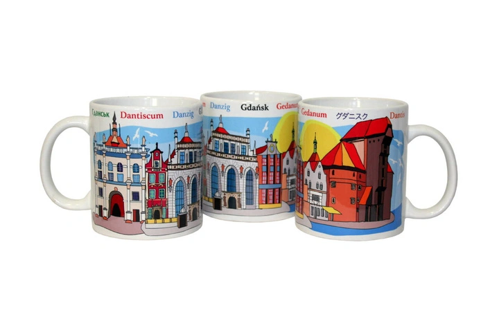 - Biały kubek z malowanymi zabytkami Gdańska.