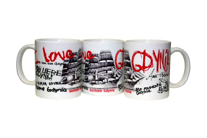 - Biały kubek z napisem "Kocham Gdynię" w kilku językach.