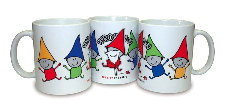 - Biały kubek z kolorowymi wrocławskimi Krasnalami